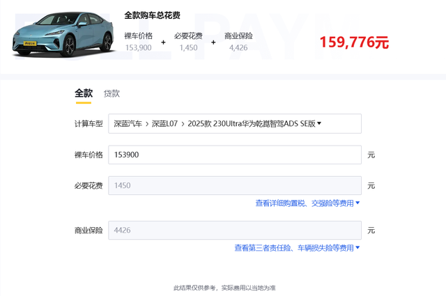 最后就购车费用来看,深蓝L07目前终端优惠后的裸车价格是153900元,算上保险、上牌等费用,合计下来的落地价格也才159776元(仅供参考,以当地经销商为准),不到16万的价格对于一台能够实现华为智驾的家用车来讲,无疑是十分划算的,比如与深蓝L07搭载同款智驾的阿维塔 07都要20万起步,该车的性价比可想而知。